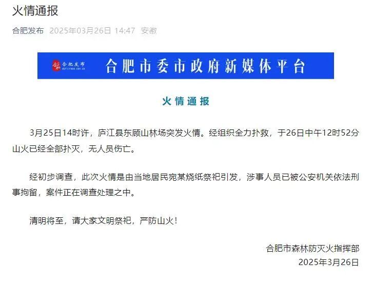 3月25日14时许,庐江县东顾山林场突发火情。经组织全力扑救,于26日中午12时52分山火已经全部扑灭,无人员伤亡。经初步调查,此次火情是由当地居民宛某烧纸祭祀引发,涉事人员已被公安机关依法刑事拘留,案件正在调查处理之中。清明将至,请大家文明祭祀,严防山火!